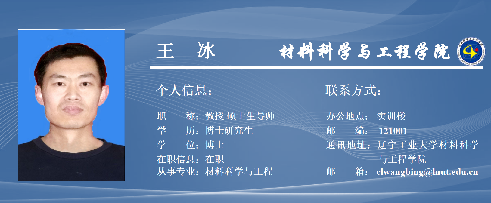 王冰,男,1976年生,辽宁阜新人,博士,教授,硕士生导师,辽宁省高校优秀人才二层次。2008年毕业于北京科技大学钢铁与生态公司。“液态结构及其处理技术”辽宁省高校创新团队的骨干成员。中国金属学会材料科学分会会员、中国金属学会电磁冶金与强磁场科学分会会员、中国有色金属学会会员,J. Mater. Sci.-Mater. Electron., J. Alloys Compd., Phys. Status Solidi B, J. Mater. Sci.等期刊审稿人。