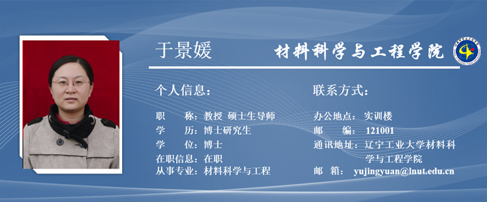 于景媛,女,1979 年生,辽宁抚顺人,博士,教授,硕士生导师,入选辽宁省“百千万人才工程”万人层次、辽宁省优秀人才支持计划,担任教育部学位论文评审专家。获东北大学材料学博士学位。International Journal of Applied Ceramic Technology 等期刊审稿人。
