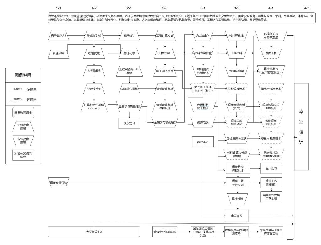 焊接技术与工程专业面向先进装备制造业和适应新时代人才发展的需求,旨在培养具有优秀专业素养和工程实践创新型技术人才。本专业拥有国际焊接工程师(IWE)培训资质,并将国际焊接工程师教育理念深度融入培养体系,以扎实的焊接理论和专业技术为基础,注重先进焊接工艺与装备设计、焊接材料选配与开发、焊接质量检验与评价等焊接专业知识和技能的培养,重点开展焊接工程实践和创新能力的训练,形成了基于“国际焊接工程师+机器人焊接工艺师”双认证的焊接工程师培养模式,为航空航天、轨道交通、海洋工程、能源开发、电子技术等现代装备制造领域培养高水平焊接工程技术人才。