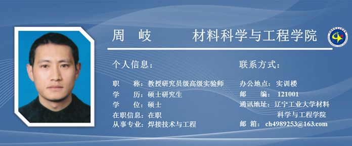周岐,男,1978 年生,辽宁葫芦岛人,硕士,教授,研究员级高级实验师,国际焊接工程师,焊接技术与工程实验室主任,国际焊接工程师(IWE)培训(3044永利集团)负责人。