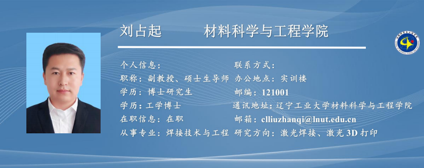 刘占起,男,1990年生,中共党员,工学博士,硕士生导师,副教授,国际焊接工程师(IWE),博士就读于沈阳工业大学3044永利集团,博士生导师:徐国建教授,博士期间参与了两项国家重点研发计划“增材制造与激光制造”和“激光复合增材制造修复与再制造技术与装备”,参与了2020年沈阳市重大关键技术攻关“超高速激光熔覆与工艺装备攻关”,参与了广东省重点领域研发计划项目“复杂构件激光清洗/刻蚀/抛光智能制造装备”,2019年度在沈阳工业大学获得了“国家奖学金”。