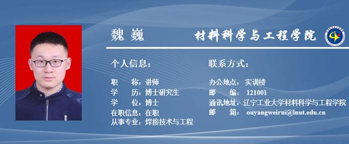 魏巍,男,1995年生,博士,硕导,辽宁省焊接学会理事。国际焊接工程师(IWE),中国焊接结构设计师。荣获辽宁省优秀博士论文、锦州市自然科学学术成果二等奖。在International Journal of Mechanical Sciences(机械科学与力学领域顶刊,中科院1区top,IF:7.2)、Engineering fracture Mechanics(断裂力学领域顶刊top,中科院2区,IF:5.4)、Materials Characterization(材料表征领域顶级期刊,中科院2区top, IF:4.8)、European Journal of Mechanics/ A-Solids(固体力学顶级期刊top, IF:4.4)、Materials today communications以及焊接学报(国内焊接领域权威期刊)等期刊发表了20余篇SCI、EI论文。