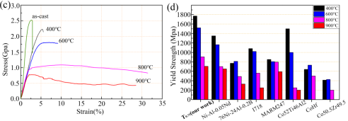 新型耐高温高熵金属间化合物合金的高温力学性能,以及与其它类型高温合金的性能对比
